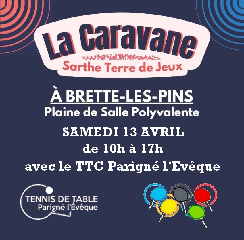 Dans le cadre de la "Caravane Terre de Jeux" le 13 avril 2024 de 10 à 17h, le TTC Parigné l'Evêque proposera une animation tout public de tennis de table.