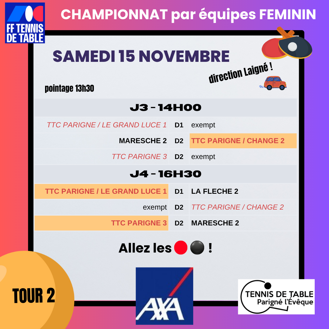 Le club de Laigné, recevant cette journée, a informé qu'il n'aurait la salle qu'à partir de 13h30.